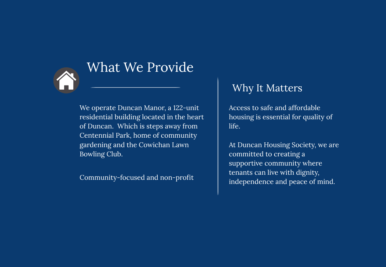 Duncan Housing Society has been proudly servicing the community for over 40 years, providing affordable housing and supporting independent living for those who need it most.